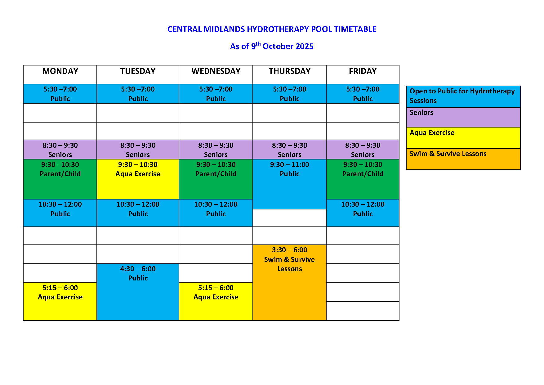 The Hydrotherapy Pool timetable is subject to change due to public holidays, staff absences, changes to programming and other unforeseen events.