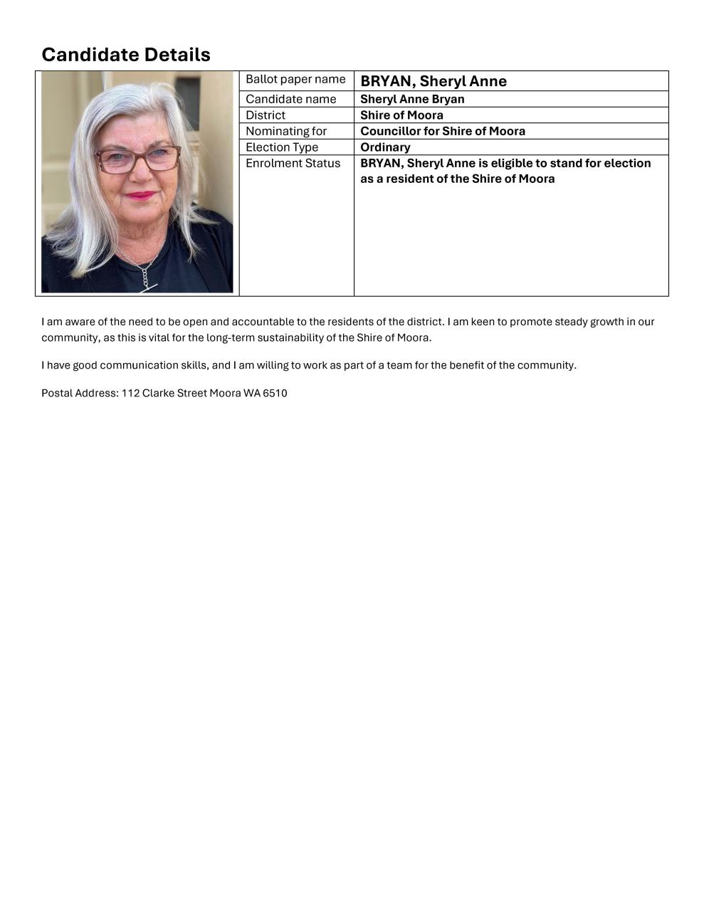 The Shire of Moora runs postal elections. Postal Elections is a process in which individuals on the state electoral role for our region and any individual on the Shire’s owner & occupier role are sent a voting package to their mailing address along with a return envelope.