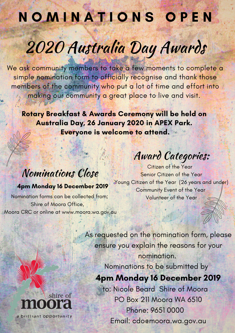 2020 AUSTRALIA DAY AWARDS NOMINATIONS OPEN Published: Tuesday, 22 October 2019 at 11:36:08 AM https://www.moora.wa.gov.au/community/whats-on/australia-day-awards.aspx Back to All News